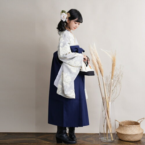 【リサイクル着物セット】2尺袖着物 袴 2点セット 袴84cm(身長143-150cm) 袴セット 卒業式 国内染色 ジュニア 着物 花柄 女の子 グレー系 子供 kids 灰色 白 黄色 グレイッシュ ミモザ フラワー ニュアンス くすみカラー 大正浪漫 モダン 小学生 専門学生 国産生地