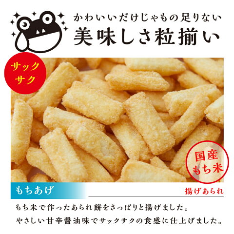 幅広い世代に人気の揚げあられ、もちあげ甘辛醤油」味。