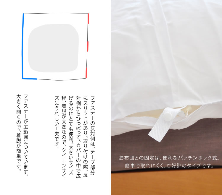大きく開く、L字型のファスナー、そして、反対側から伸ばしやすい、スリット窓、お布団の固定は、ワンタッチのパッチン式テープ。