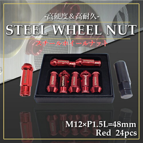 カラーはスポーティなレッド 【適合】 ■M12×P1.5 トヨタ ホンダ 三菱 マツダ ダイハツ (スバル、スズキ、日産の一部車種も適合可能) ※適合参考表ページ下部に掲載しております ■貫通スチールロングナット ■カラー:レッド ■セット内容:24個+ソケット付属 ■直径:22mm ■L=48mm ■17HEX ■座面テーパー角:60度 ※本商品はテーパー60°を採用したホイールナットです。