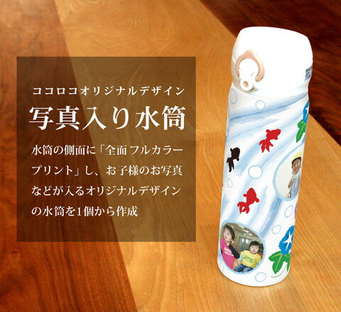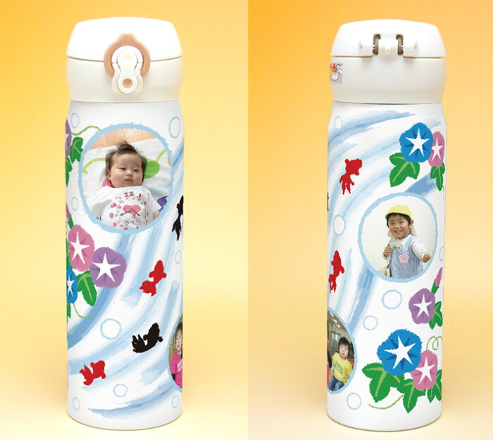 お子様の写真が入る、金魚と朝顔柄水筒最軽量210gのサーモス製水筒の側面全面にフルカラープリントした「写真入りの水筒」を1個から作成いたします。
