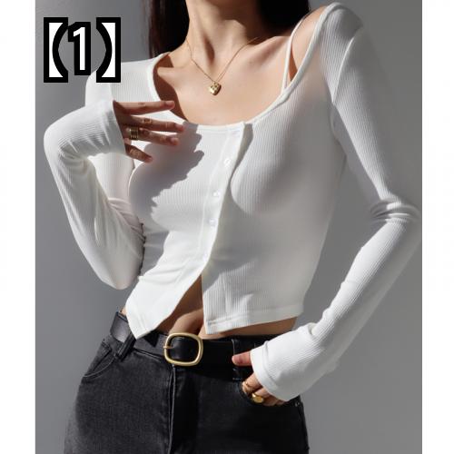 肩だし トップス レディース 長袖 ボタン かわいい 春夏 オープンショルダー ショート丈 へそ出し タイト スリット セクシー 白 黒
