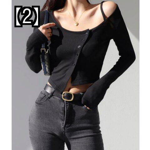肩だし トップス レディース 長袖 ボタン かわいい 春夏 オープンショルダー ショート丈 へそ出し タイト スリット セクシー 白 黒【1】白 / S【2】黒 / S【1】白 / M【2】黒 / M