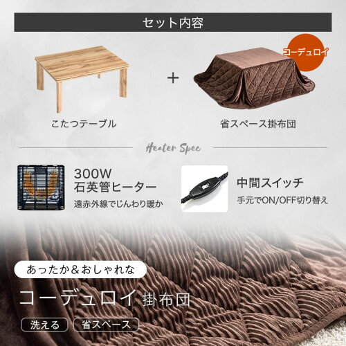 【今だけクーポンで200円OFF】 ヴィンテージこたつ 2点セット 長方形 75×60 こたつ + 掛布団 コーデュロイ コタツ 炬燵 こたつテーブル テーブル リビングこたつ こたつ布団 セット コンパクト 省スペース 一人暮らし モダン 北欧 おしゃれ シンプル 木目調