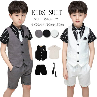 男の子 スーツ フォーマル 4点セット 子供スーツ 夏 ベストスーツ ピアノ 発表会 フォーマルスーツ 男の子 ストライプ柄 半袖シャツ 半ズボン 90-170cm キッズ 結婚式 七五三 入学式 入園式 お受験 子供服 キッズスーツ ブラック ホワイト グレー